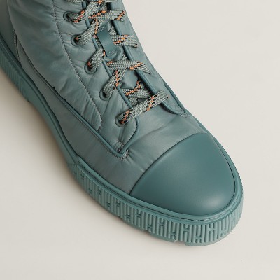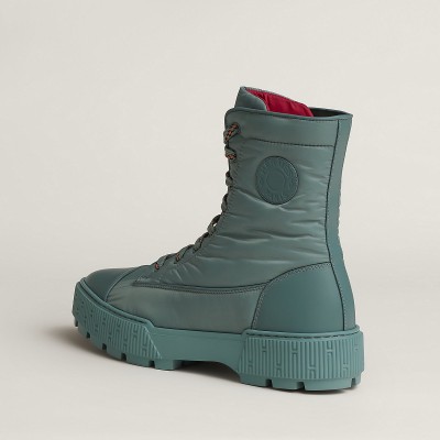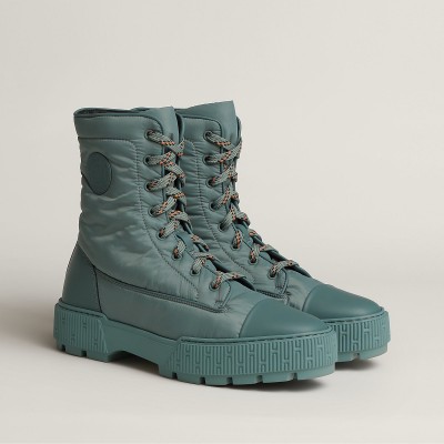 Water repellent ankle boot in calfskin and light parachute fabric with rubber sole.