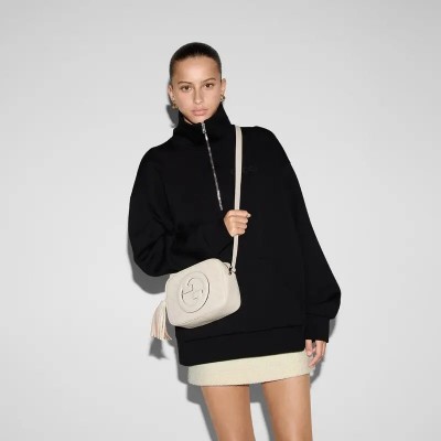 This piece is from the Gucci Lido collection, which is inspired by the summer style and beach clubs on the Italian coast. The round interlocking double G from the brand's archive design is a refined interpretation of the Gucci Blondie series.