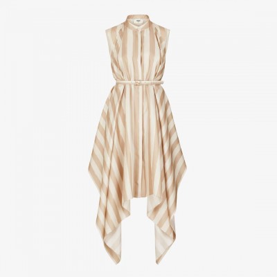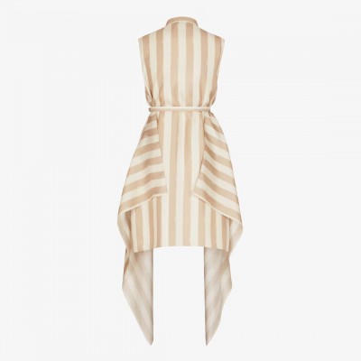 Short sleeveless dress with a small stand-up collar. Silhouette with large flowing handkerchief patch on the front. Hidden front placket. Made of silk with signature beige Pequin stripe pattern. Made in Italy
