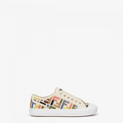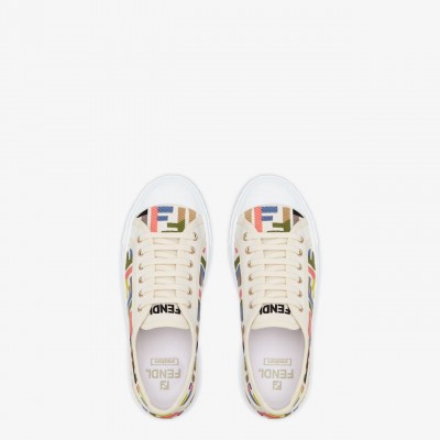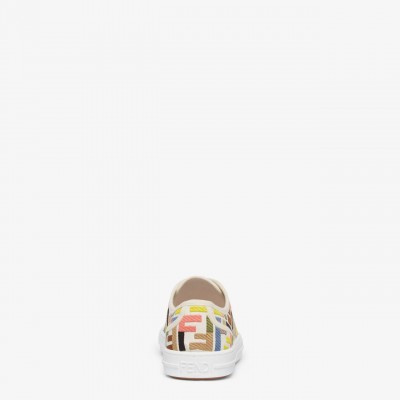 Domino sneakers with rubber sole. Made of canvas with colorblock FF embroidery. White sole with contrasting base, embossed texture combination, superimposed FF motif on toe and FENDI Roma logo on heel. Additional white laces. Made in Italy