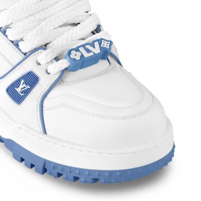 The LV Trainer Maxi is a magnified version of Virgil Abloh's classic LV Trainer sneaker, crafted in cowhide leather for women. It features a large padded tongue and a thick outsole, while the rubber logo details and wide textile laces are embellished with Louis Vuitton signature beads.