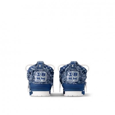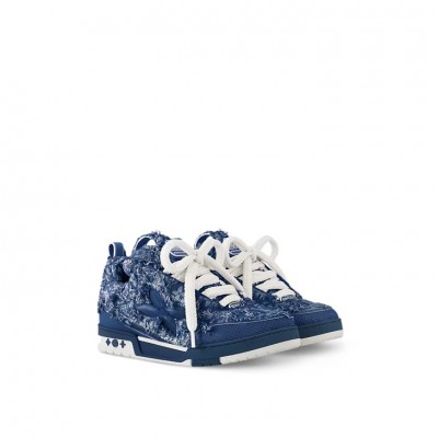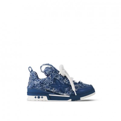 The LV Skate sneaker is made of brushed Monogram denim and features double laces to complete its avant-garde look. The large, distorted Monogram flower on the side pays homage to 1990s sneakers and is echoed by the Monogram flower on the chunky outsole.