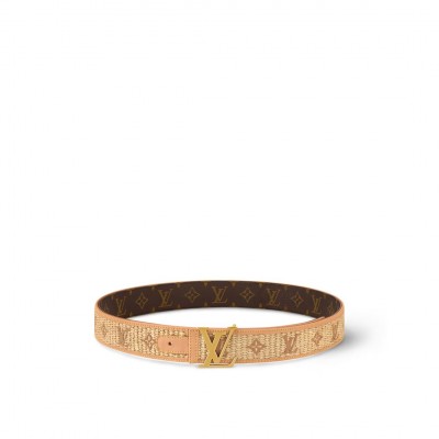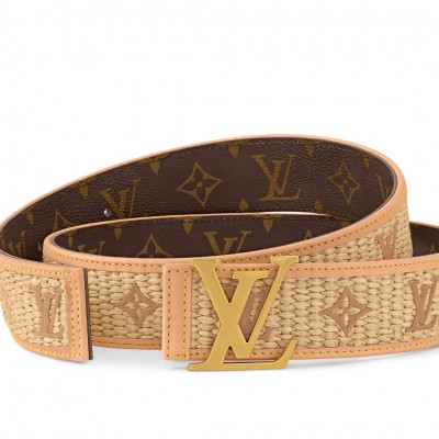 Inspired by the tropical island theme of the season, this reversible LV Initiales belt features an embroidered Monogram motif on one side in woven raffia and Monogram canvas on the other. The brass LV Initiales buckle adds a sunny touch.